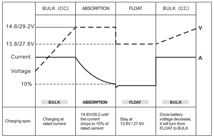 Akkumulátorvezérlés (3 fokozatú akkumulátortöltők) Tömeges / Abszorpció / Úszó