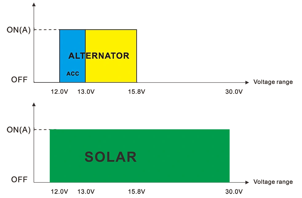 ● Univerzális váltakozó áramú bemenet 12,0V-30,0V士0,2V napenergiához/12,0V-15,BVH0,2V autóhoz
